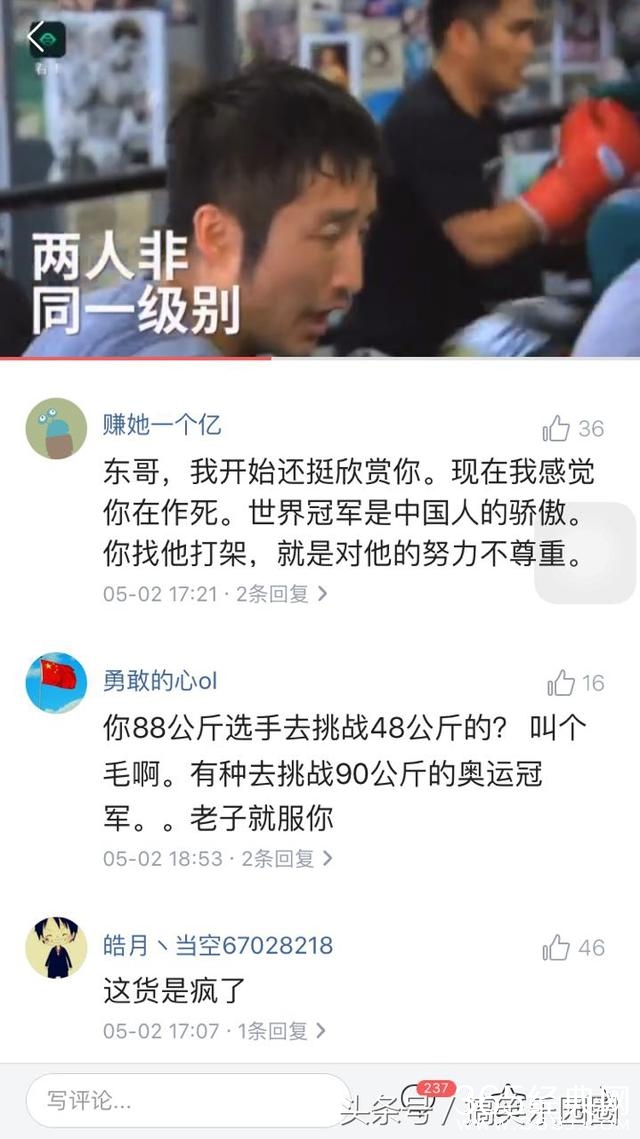 这个网友评论亮了,这货想出名想疯了,你88公斤的去挑战48公斤的你好意思,有本事去跟88公斤的世界冠军打。赚他一个亿的网友表示,东哥开始我挺欣赏你的,现在感觉你在作死,你去打世界冠军是对人家的努力不尊重。