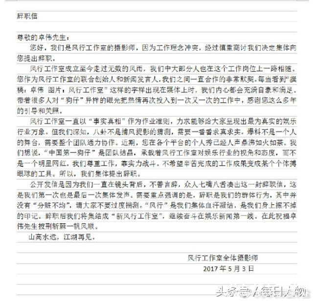 风行工作室摄影师辞职信 图据网络