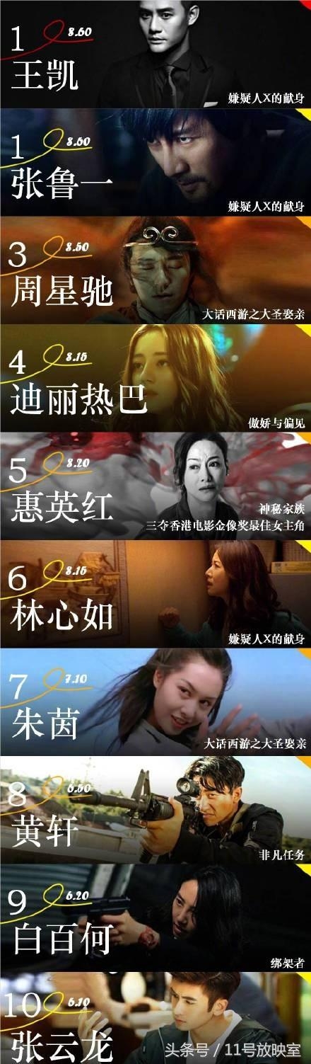 电影艺人商业价值榜TOP10:王凯、张鲁一、周星驰、迪丽热巴、惠英红、林心如、朱茵、黄轩、白百何、张云龙。