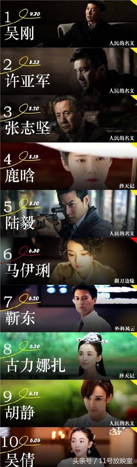 今天芒果娱乐出炉了2017年4月电影及电视剧艺人影响力月榜,其中电视剧艺人影响力月榜上《人民的名义》可谓是大丰收,不仅包揽前三,前十的榜单中也占据一半的名额。