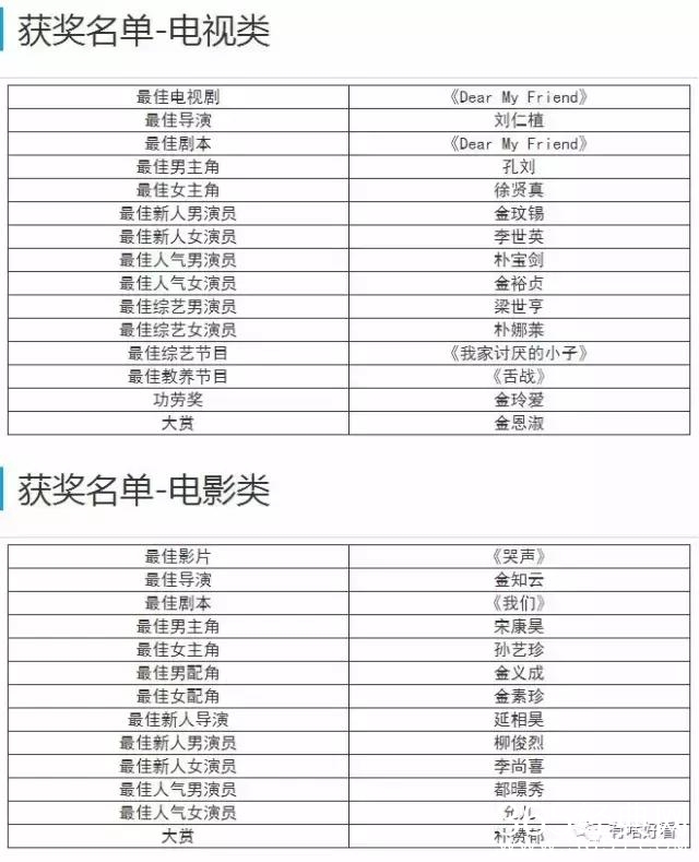 电影部门,《密探》宋康昊、《德惠翁主》孙艺珍获封影帝、影后,《哭声》夺得最佳电影奖。