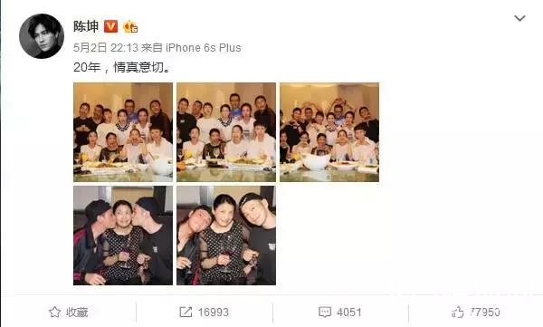 近日,陈坤通过微博晒96级北电表演班同学合影聚餐照,并称:“20年,情真意切。 ”