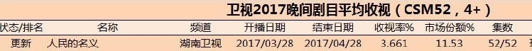 《人民的名义》一剧热播,引发全民大讨论,收视率也一路飙升,单集最高7.3%,单日最高6.7%,平均收视超过3.66%,刷新了省台卫视历史上所有收视记录,以及近六年来所有电视剧总收视记录。