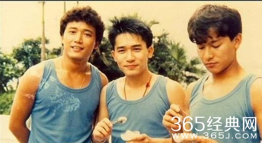 这张是刘德华和梁朝伟、苗侨伟的合照,当中刘德华嘟着嘴巴望着冰淇淋,被笑称是想讨冰吃。