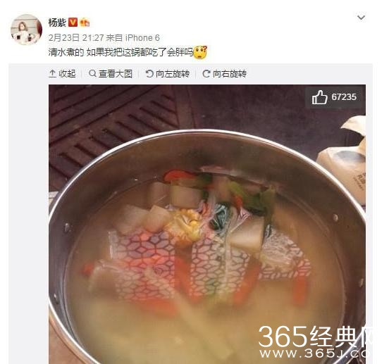 前段时间杨紫就晒出一锅清水煮菜的照片,并写道:“清水煮的,如果我把这锅都吃了会胖吗?”