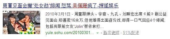 周侯恋曝光后,Jay一口否认他和蔡依林的关系,引发台湾歌坛众怒,连“花心大萝卜”吴宗宪都跳出来说:双J恋情是他撮合成的。反倒蔡依林表现冷静,尽管面对媒体时眼圈发红,可嘴上全是祝福。毫无疑问,周杰伦在蔡依林心中留下一个伤口。