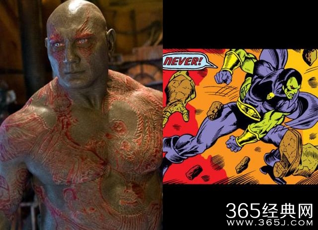 德拉克斯最早出现的时候是1968年。一个身着紫色斗篷,长着一身绿色皮肤的家伙。最开始的时候德拉克斯并不是十分强壮,后来的漫画中他渐渐变得更加雄壮。但是在电影《银河护卫队2》中,德拉克斯的皮肤却绿的不明显,感觉是灰绿色。估计可能是考虑到已经有卡魔拉一个绿皮人了,再来一个皮肤颜色相近的容易让观众误解吧。