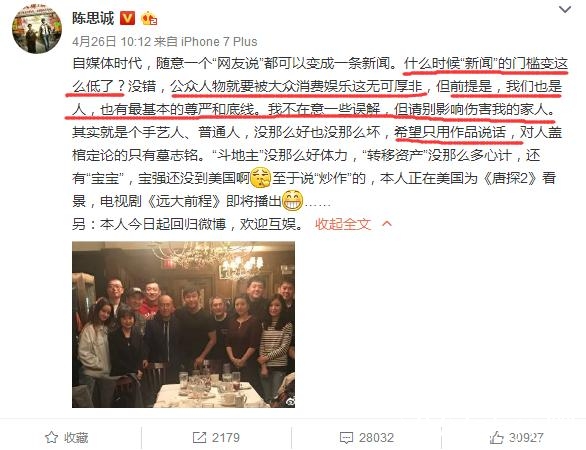 然而,网友们这一边兴奋完了,另一边却恼怒了。4月26日,陈思诚发了一条微博,称:不要随意一个“网友说”就变成一条新闻,希望大家尊重当事人,只想用作品说话,另外,重归微博,欢迎互娱。