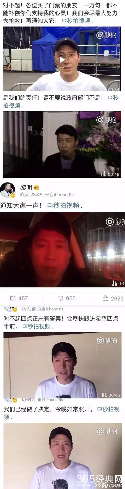 去年黎明在香港举办户外演唱会,由于场地现场布置使用的帐篷物料不符合要求拒发演出牌照。歌迷已排起长队,开演在即被叫停,可以算一次严重的演出危机。对此,黎明的反应是第一时间积极回应,并随时跟进进程,向大家汇报。从昨天出事到今晚,黎明共在微博上发了5段视频,解释说明并跟进最新进展。