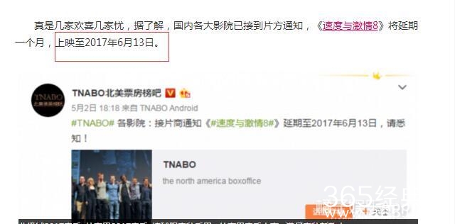 据了解,国内各大影院已接到片方通知,《速度与激情8》将延期一个月,上映至2017年6月13日。
