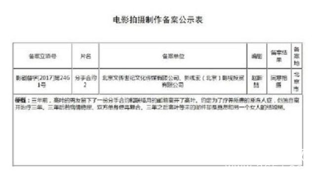 近日,微博上有人传出电影《分手合约》续集立项,将会开拍,剧情是这样的:男主得了渐冻人症,决定离开女主高叶,临走留下分手合约和联系邮箱,约定若三年之后病情稳定、双方单身就再度复合,可是三年后女主高叶等来的却是男主与别人的结婚照......