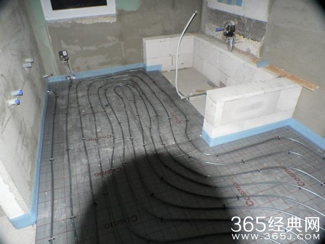 浴室一瞥,浴缸位置做了围护,地面铺设地暖,墙体下部做了隔热处理,降低能耗。