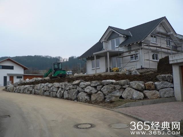 别墅四周做好了绿化,因建址有坡度,所以用石块作了围护,同时点缀环境