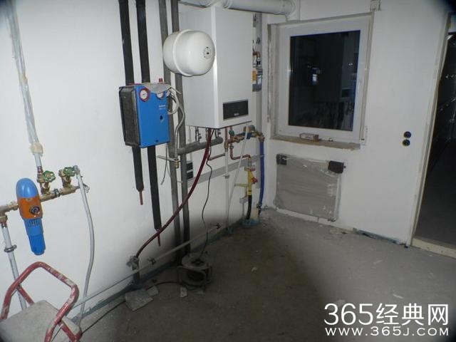 设备间。由左向右依次是水源前置过滤器,热水增压装置,白色圆筒应为生活用水增压装置,最右边为燃气壁挂炉。
