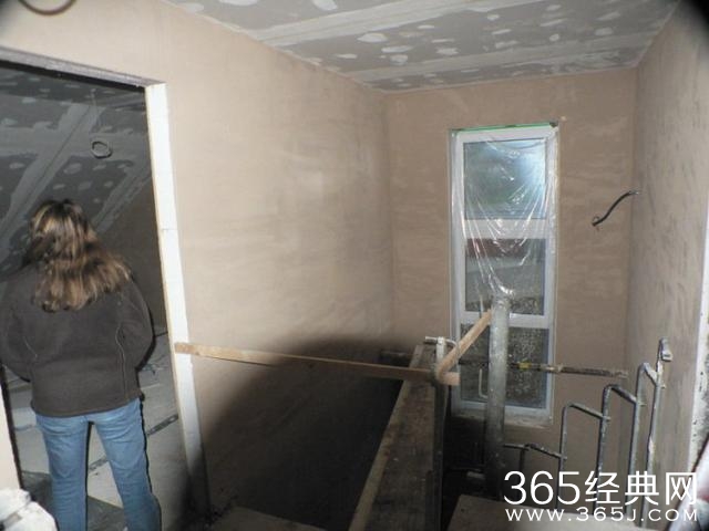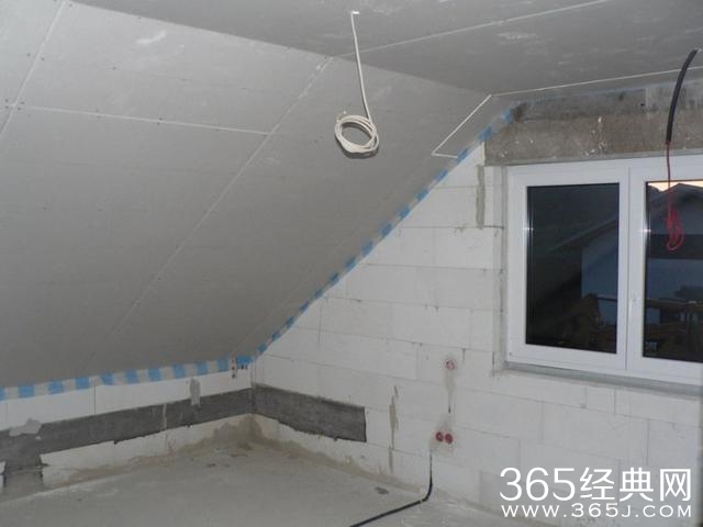 阁楼中,可见石膏板已安装,石膏板后使用特厚岩棉做保温处理,并铺设了防水材料,感兴趣的朋友可以翻看小编之前关于屋顶处理工艺的相关文章。