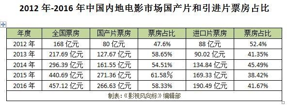 根据国家新闻出版广电总局公布的数据显示,2012年,中国内地电影市场全年票房超过168亿元,其中,国产片80亿元,占47.6%。进口片票88亿元,占52.4%。这是近五年来国产片年度票房唯一一次落后于进口片。从2013年起,国产片年度票房连续四年超过进口片。