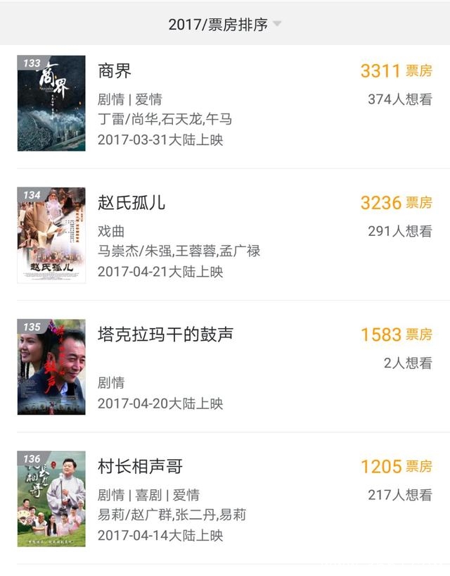 截至5月3日,今年已有31部影片票房过亿,有21部影片票房在1000万元至1亿元之间。票房100万至1000万(不含)的影片30部,票房10万至100万(不含)的影片24部,票房10万元以下的影片居然多达20多部!都是国产片,票房最低的影片只有1205元!除了几部京剧电影是北京电影节展映片之外,多数是在院线上映的院线电影,票房如此之惨,令人难以置信。