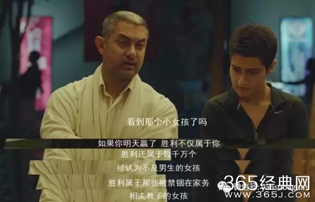 在关键性的一场比赛里,女儿问爸爸摔跤策略,阿米尔汗让她记住,她的对手不止有摔跤场上的那位,还有歧视女性的人。