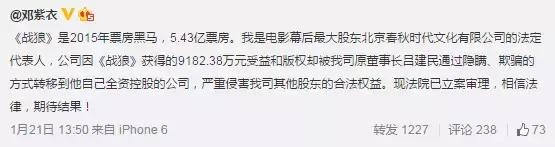 2016年初《战狼》内女参谋的饰演者兼出品公司法人邓紫衣在微博上发了这样一条请求维权的微博。