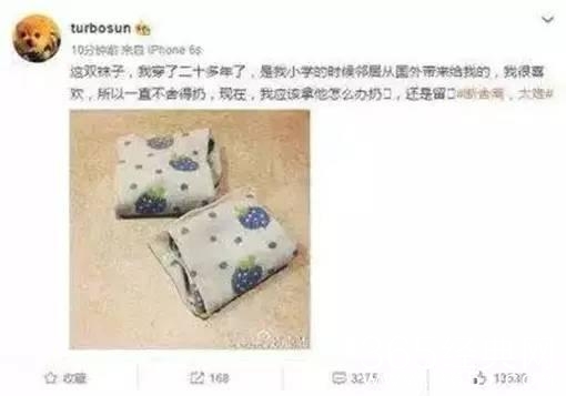 孙俪曾在微博晒出一张自己袜子的照片,并留言:“这双袜子,我穿了二十多年了,是我小学的时候邻居从国外带来给我的,我很喜欢,所以一直不舍得扔...