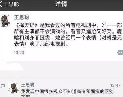 吐槽了《择天记》就算了,顺便连刘亦菲也一起吐槽了!说两人“用一个表情演了好几部电视剧。”