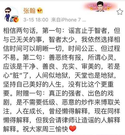 而在转过年也就是2017年的3月15日,张翰首次在微博上回应此事