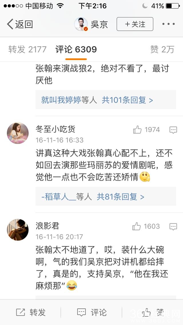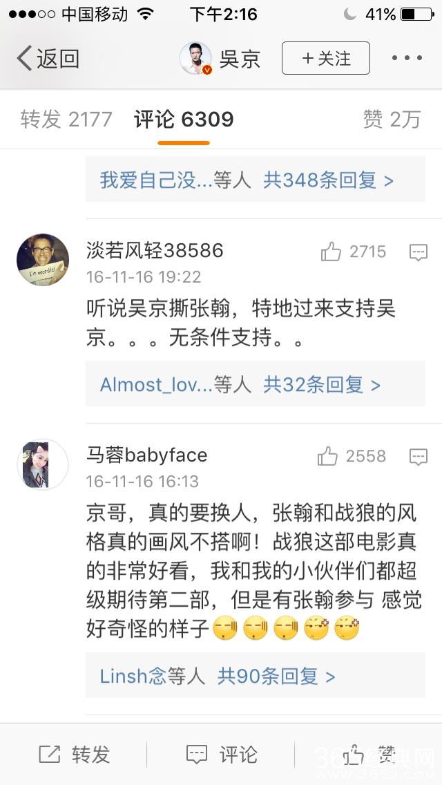 网友也在吴京的微博下面留言:强烈希望吴京换掉张翰。