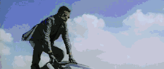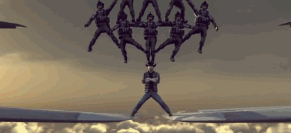 查克这个无法战胜的男子当然不会认输,他头顶11个伞兵叠罗汉组成人肉圣诞树,一边背诵《哈姆雷特》第一章第一幕的台词,一边在两架飞机的翼尖劈叉。