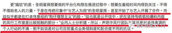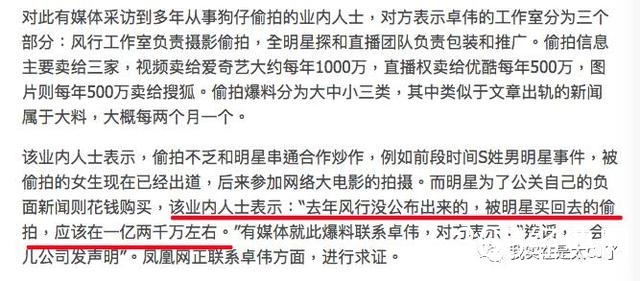 风行员工集体出走之后,媒体曾经出过一篇稿子,表示卓伟的偷拍有炒作也有高价卖给明星做公关的,被买走的偷拍也值个一亿两千万元。