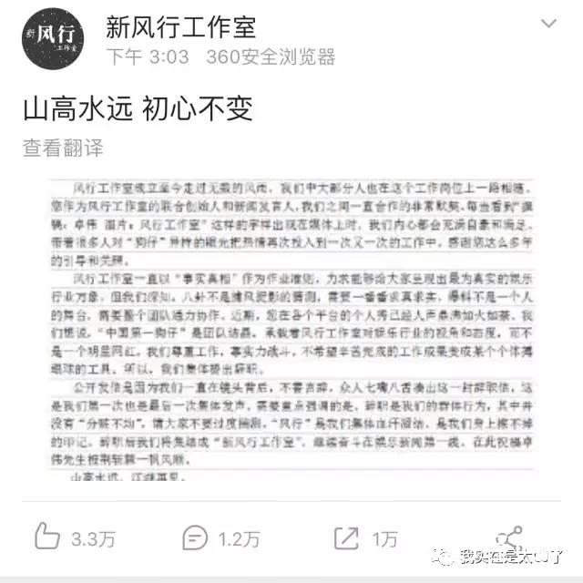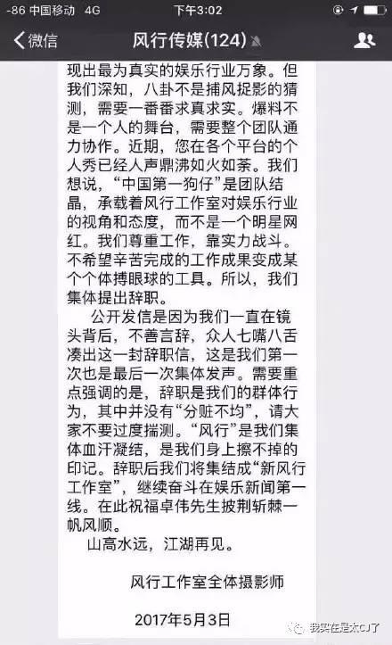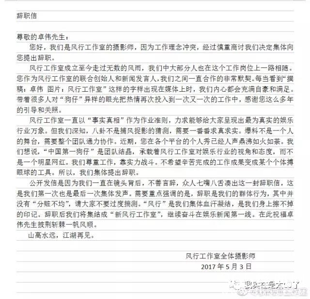 这周三我们没有等来什么“周三见”的大料,却无意中见证了一段历史:风行工作室全体摄影师向卓伟提出辞职,并成立了新风行工作室。