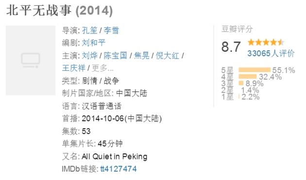 2014年孔笙、李雪执导的《北平无战事》在豆瓣上评分高达8.7分(图/豆瓣)