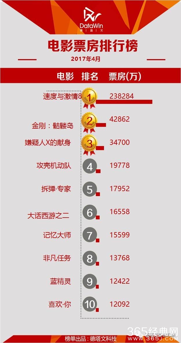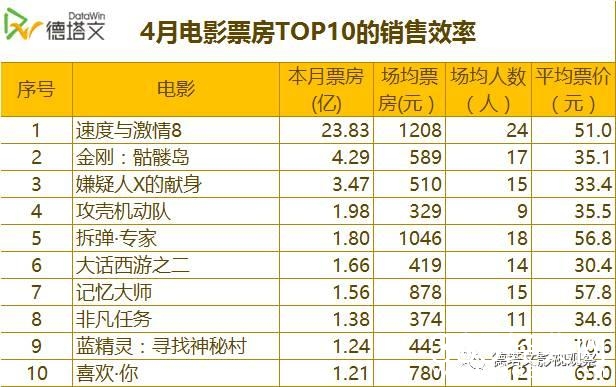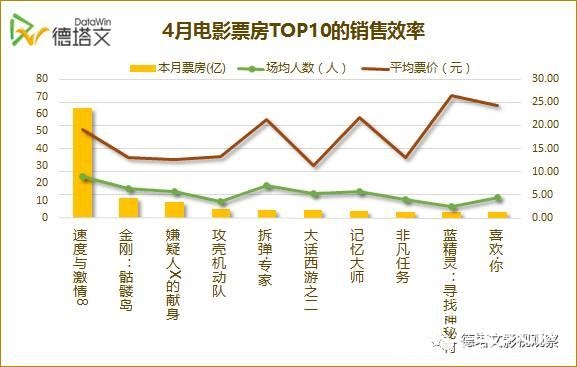 4月销售效率最高的影片显然是《速激8》,不但有高得吓人的平均票价,场均人数同样是冠军,怎能不拿下票房奇迹。