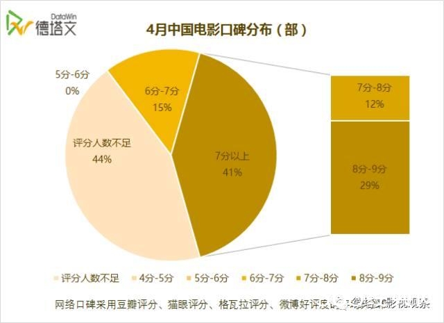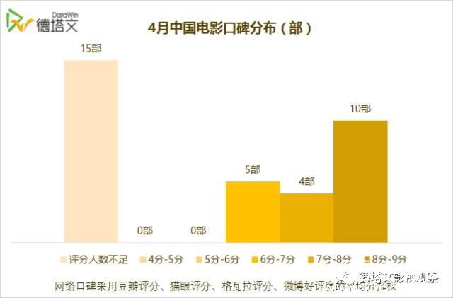口碑方面,达到及格线6分以上的影片有19部,除了评分人数不足的少数作品,四月作品质量及格率几乎100%,好评率相当高。这似乎也印证了DataWin之前几个月来观察到的现象,即当前的国产影片质量水准在上升,或者说至少观众满意度在上升。国产影业经过一段烂片也卖座到烂片无法不卖座的洗礼,也许已经进入理性发展阶段,质量与票房的正相关让电影质量开始上升。