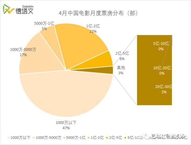 四月上映的电影总数较少,共34部,票房也呈现三段式表现,一部巨片《速激8》独揽24亿票房;10部中片进入1-5亿区间;剩下的则是票房不过亿、甚至不过千万的小片。
