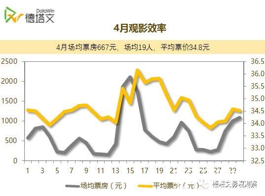 本月平均票价较之三月高出0.3元,增长幅度不明显,主因是15日周末《速激8》大卖后的爆冲。场均票房667元,场均人数19人,成绩尚可。