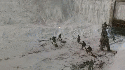 长城决战也是一幕宏大的战争场面,守夜人军团,面临来自绝境长城内外的两面夹击。野人首领事先说过,要在长城之外,燃起一场当世最大的森林大火为号,开始进攻。长城之外的景象,全部是电脑特效。