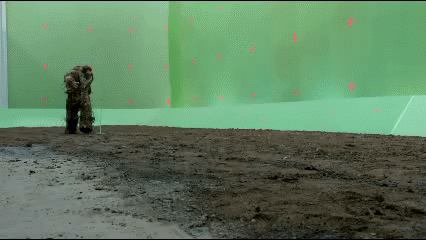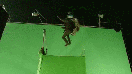 在后期特效流程中,镜头内的简易模型和绿衣人员,都会被抹去、再换上数字版猛犸象: