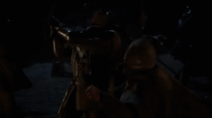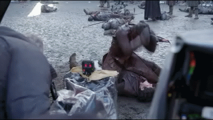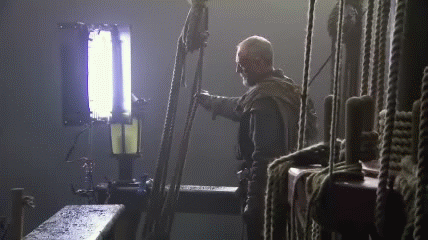 在拍摄斯坦尼斯舰队上人的反应时,就得尽量实拍了。现场用高强度闪光灯,模拟爆炸对场景光照的影响,爆炸冲击波对人体的影响,则是用强力鼓风机来模拟。扮演斯坦尼斯得力助手达沃斯的老演员,决定亲身上阵,完成受爆炸冲击的特技动作。简而言之,就是最早从香港电影人那偷师来、后来被好莱坞电影人发扬光大的“吊钢丝”。