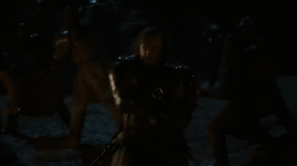 这一集的混战场面,让好人多看得热血沸腾;其实,很多看似惊险或危险的镜头,是特效合成的结果,现场并不像画面表现的那般千钧一发。不少画面内元素,都在可控环境下拍摄。像战马倒地的镜头,就可通过后期特效,方便地“塞入”混战全景画面中去,像这个巨人“温温”掀翻一匹战马的镜头,就是在绿幕前拍摄,通过后期合成数字战马、以及实拍外景来实现的。