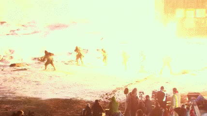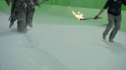 爆炸除了火光,还会产生烟尘等其他微粒效果,这些也都是在现场实拍的素材,扮演身上着火的野人士兵的替身们,直到导演喊停,才会有剧组成员上来灭火: