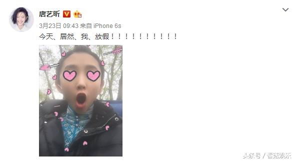 比如发个自拍也要自嘲“黑洞自拍”,难得放假不仅惊呼“今天居然我放假”,而且会配个搞怪的图片!在这样无止境开心的分享下,唐艺昕带给粉丝一种每天都要快乐的正能量!