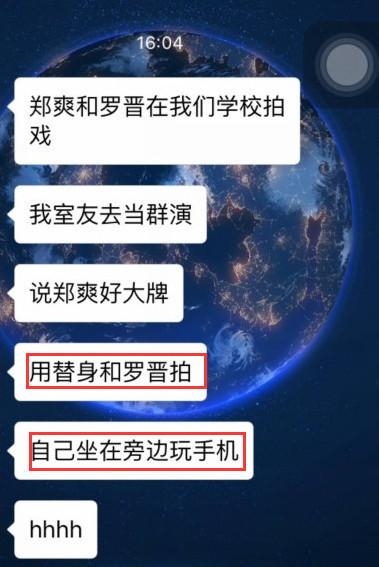 但是,其间也有“不和谐”声响,有网友爆料称,郑爽拍戏耍大牌,自个坐着玩手机,让替身与罗晋对戏,并晒出替身的相片。粉丝则表明别的群演眼里郑爽极好,但该网友表明这也是群演之一的观念。