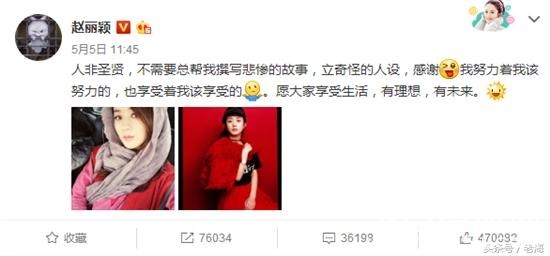 也许是因为之前媒体写的故事太过悲惨?或者说歪楼了?没有按照明星想的剧本继续下去,为了避免不必要的麻烦,赵丽颖才选择此时发声。毕竟如今的她已经是高大上的代名词。如果说放在以前,可能已经没有什么办法改变什么,幸好年轻一代明星拥有了自媒体,有微博直播平台供他们及时公布自己的真实想法,有必要时还可以给自己发声明来正名,否则,真是有冤无处诉了。也正是这样,此时,突然觉得这位清纯妹纸其实情商也真是不一般,否则也不会年纪轻轻就已经是圈内举足轻重的艺人啦。
