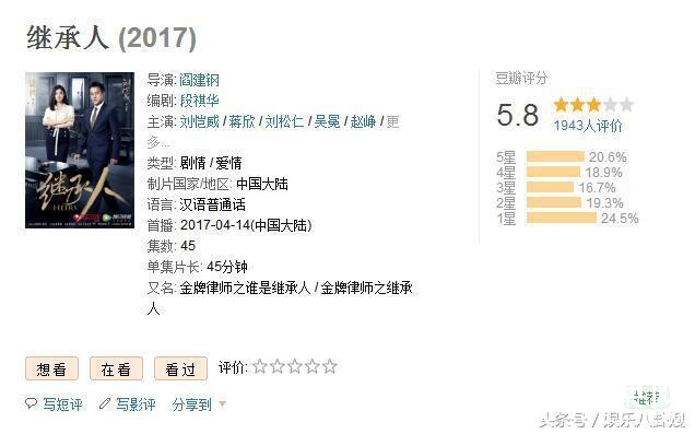 虽然《继承人》这部戏有刘恺威的出演,这也是他第一次主演都市情感律政题材的电视剧,但是这样低的评分,到底是这部电视不吸引人,还是说刘恺威现在已经是一个过气的明星?