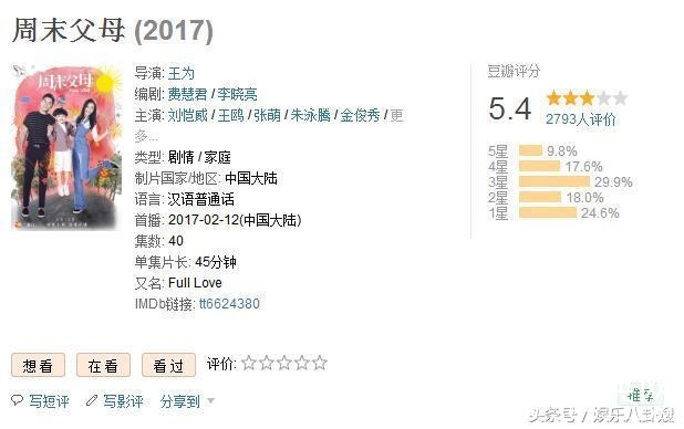 刘恺威在2016主演的电视剧《周末父母》,评分只有5.4分。