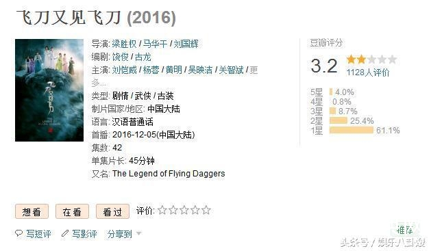 刘恺威在2016主演的电视剧《飞刀又见飞刀》,评分只有3.2分。
