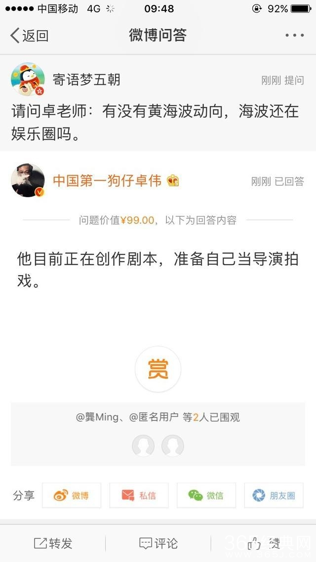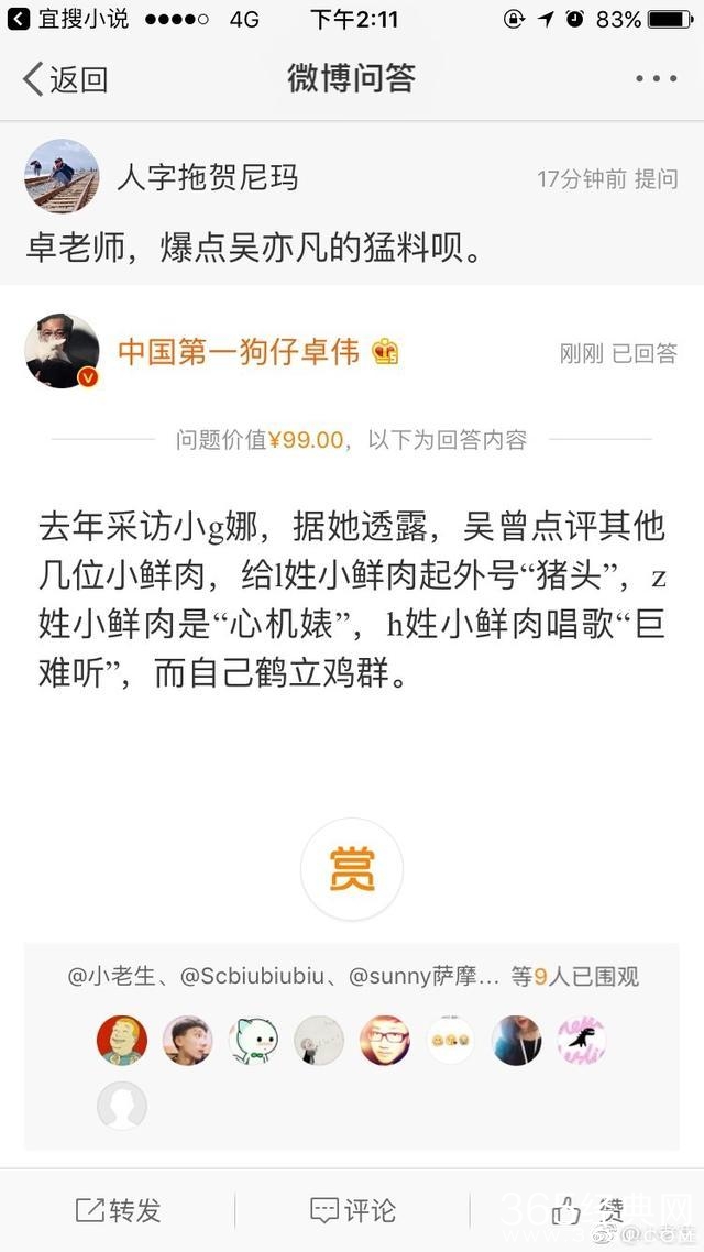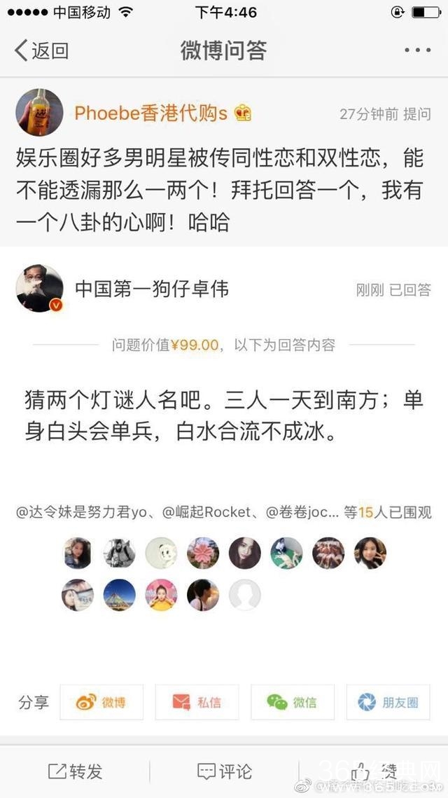 回答的领域也挺广,男星女星、过气的当红的给人一种中国第一狗仔名不虚传的感脚。其实小编对这些回答人物,就当是娱乐是看看就好,不可当真。毕竟是口说无凭的事。看客们,你们说呢?
