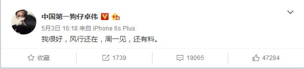 有中国第一狗仔之称的卓伟在前两天面临员工的集体辞职之后,发微博说:我很好,风行还在,周一见,还有料。近来卓伟爆料的一些八卦在网上产生非议,说卓伟之所以热衷于偷拍跟踪当红明星,全是因为想榨取明星的封口费。这些看法小编觉得也都是仁者见仁智者见智吧。至于说周一见,还有料,这次他没有给出任何关于爆料的提示,看来卓伟是让不少明星过不好这个周末了。