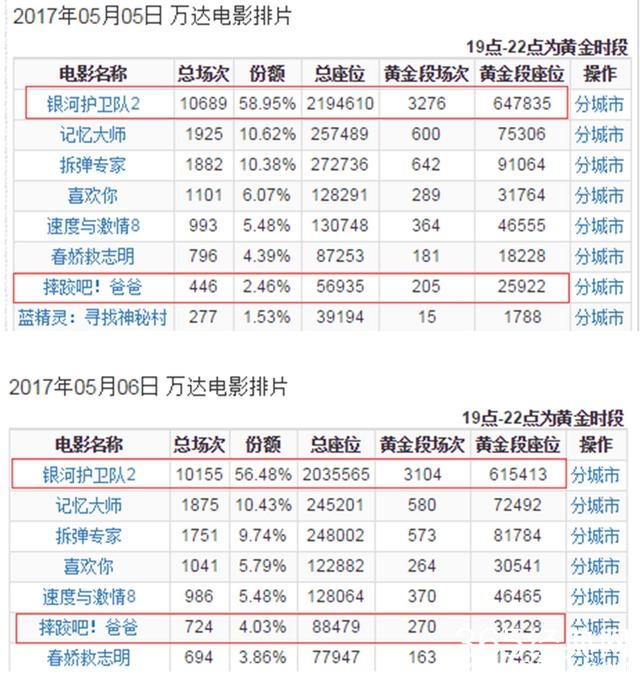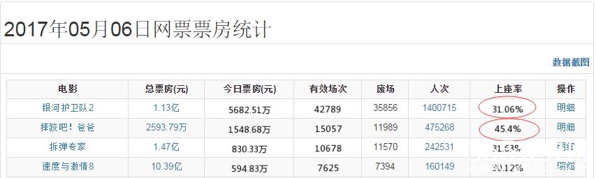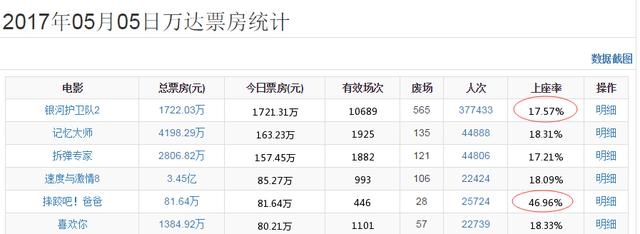据统计,5月5日在万达院线中,《摔跤吧,爸爸》的上座率以46.96%狂甩《银河护卫队2》的17.57%,如果万达只是因为《摔跤吧,爸爸》不卖座而不给其排片的话,那么上座率则实力打脸。