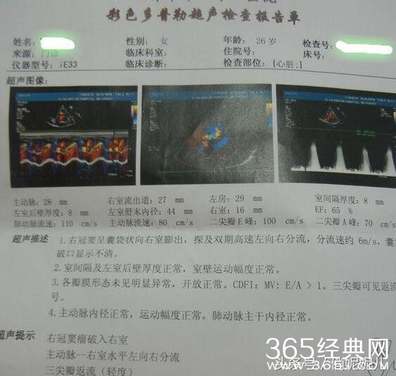 不久前和老公讨论起顺产还是剖腹这个问题,我说我想顺产,老公说,你小时候不是心脏不好吗,不能顺的吧,不然去查查心脏做个彩超好了。虽然我觉得查心脏彩超没有什么意义,但还是去了,结果被诊断为窦瘤破裂,做彩超的医生说生完了做个小手术就可以了,我也觉得没多大事。